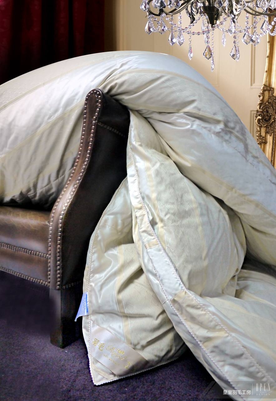 冰島雁鴨絨(Eiderdown)聚熱效果極佳,3秒便能瞬間吸熱,同時還具有恆溫效果;一床被子僅有1公斤重,冬暖夏涼一年四季皆適用,一條羽絨被能使用30年以上。皇室羽毛工房看見牠得天獨厚的優勢,因此遠從冰島產地直接進口,經國寶級師傅手工編製,以「3公分21針」的車縫技術,將柔暖細緻的愛包藏在被芯中。