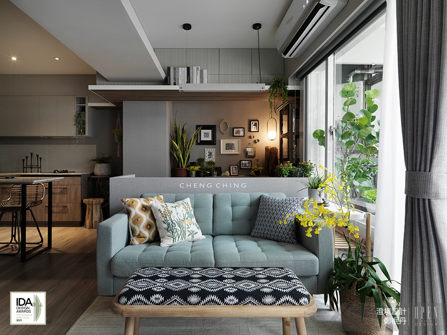 ▲客廳選用綠色系沙發搭配圖騰跨腳凳,與一旁的陽台蔓延入室的綠意,共創恬靜天然區塊;由於舊屋硬體本身梁柱較厚實,因此使用灰、白色塊,交錯於壁面、天花板,形塑造型變化。