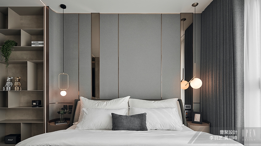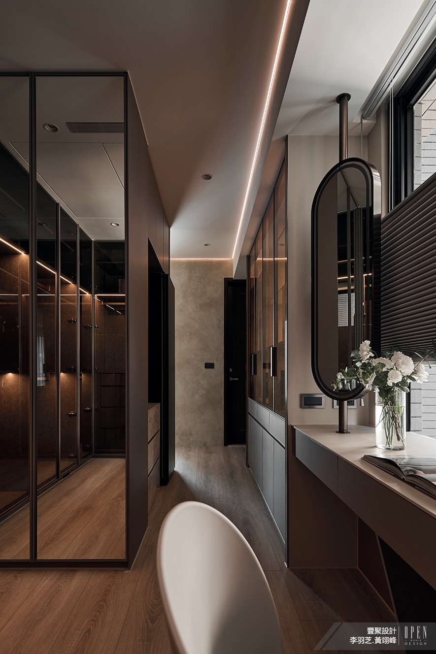 為滿足屋主希冀擁有獨立更衣室的想望,破除原格局限制,拆除與次臥間的隔牆使空間連通,大幅增加收納機能,並更改入口方向,避開進門見床的風水疑慮,以柔靜暖灰色調,鋪墊放鬆休憩氛圍。不做繁複綴飾,僅以簡約線條與材質跳色,勾勒表情輪廓,利用鋁框玻璃和茶鏡立面,延伸放大視覺,讓此區成為兼具精品收藏與個人展間的專屬VIP室。