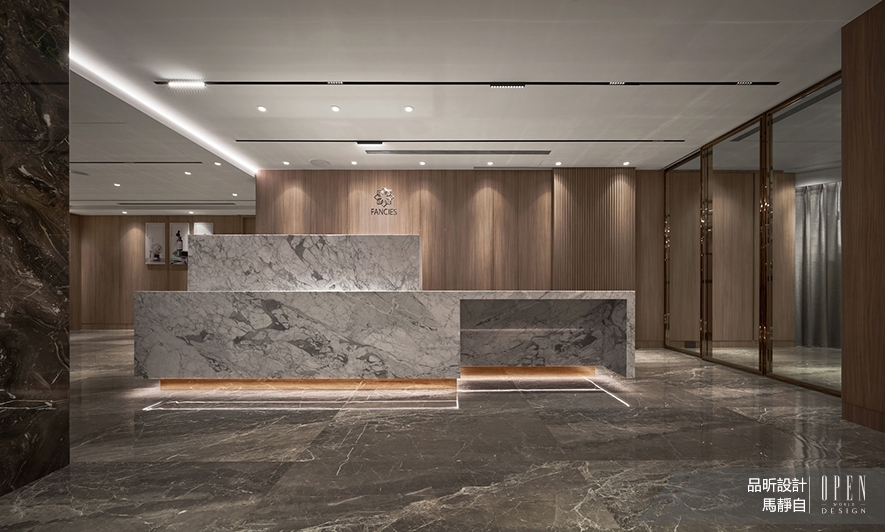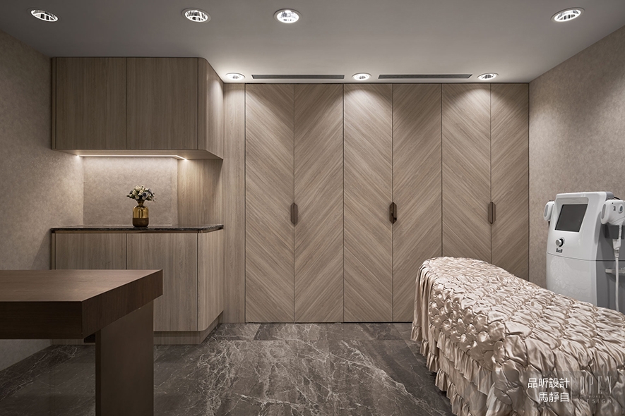 ▲診間四周壁面皆採用柔煦暖調,舒緩前來諮詢之顧客和就診者的緊張感,而深處的櫃體門片特別施作鏡像感的V字型木紋,形塑異於他處的紋理層次,為此區增添活潑變化感。