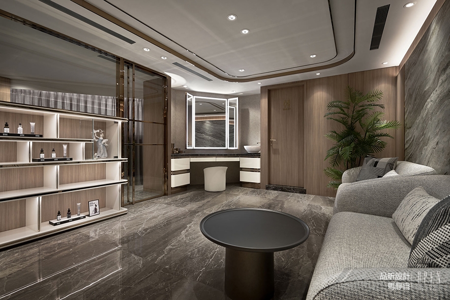 ▲貴賓休息區擺置沉穩灰調的沙發,相偕同色石紋背牆醞釀寧靜宜人氛圍,供客人結束療程後於此區放鬆憩息,也可於舒適環境中使用梳妝台洗淨、梳理妝容,讓顧客以最完美的姿態踏上歸途。