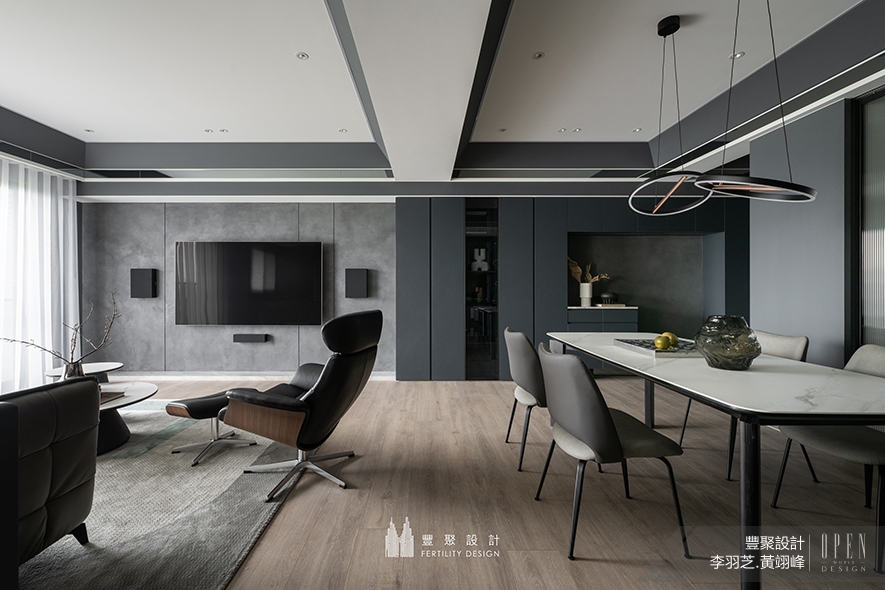 另一件《Gentle Weave 織森之紳》為新成屋案例,業主是一位年輕企業主,數年前就尋求豐聚團隊規劃客變設計,未料錯過建案客變期;多年間,屋主始終將豐聚列為首選,待預售屋交屋後,再次聯繫團隊展開設計合作。「這間案子最大的特色是導入智慧宅系統,從燈光自動感應到日常操作,皆可遠端掌控,滿足獨居業主對自用宅融匯科技與機能的嚮往。」從四口之家到單身男屋主,儘管風格迥異、互動方式有別,兩位總監仍一致秉持以人為本的出發點,透過精準而細緻的設計安排,打造出真正適合他們的空間。
