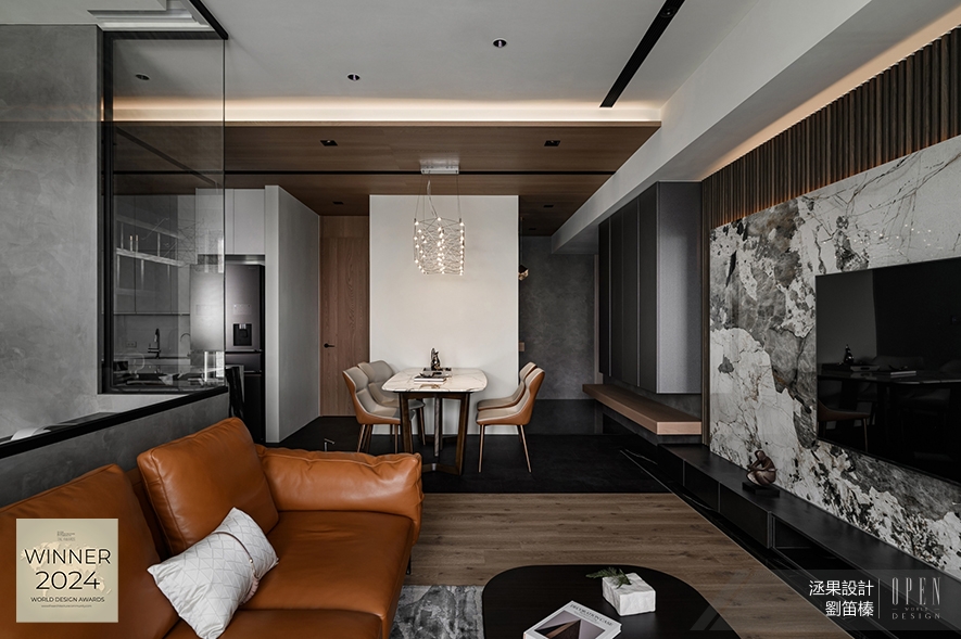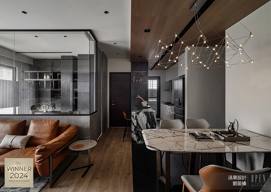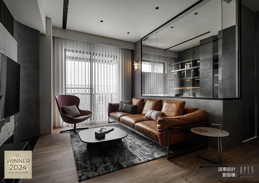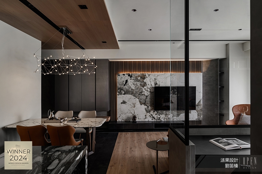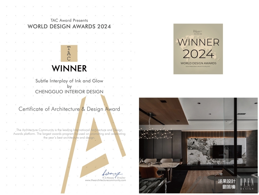 洆果設計 設計總監 劉笛榛 以沉穩暗調為基底,輔搭輕透玻璃與溫潤木質,營造現代俐落與自然溫煦的對比美學,圍塑時尚不失暖意的河畔居所氛圍;而貫穿場域的開放式動線設計與多層次光影配置,形構墨韻流淌與光景交織的詩意意象家宅作品《潤墨輕光》,於2024 TAC World Design Awards中獨占鰲頭,奪得「Winner」殊榮!關於TAC World Design Awards