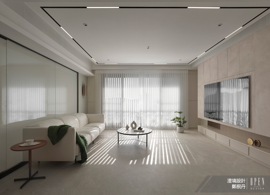 ▲客廳精心選配較寬間隙的片簾,使灑入屋中的光線因不同時序季節,於水泥灰紋理的地坪上恣意變換、投映迥異光景,為此處醞釀靈動百變的文藝氛圍。