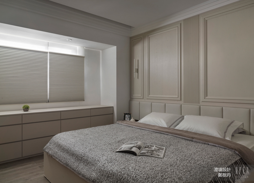 ▲主臥延續公領域的米色及線板造型,溫暖調性與簡潔畫面構築舒心酣眠場所;窗畔梳妝桌旁設置內含插座的儲納櫃,貼合生活習慣,提升日常便利性。