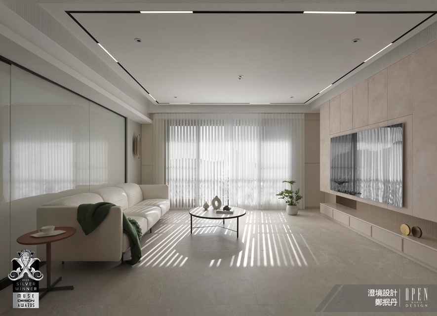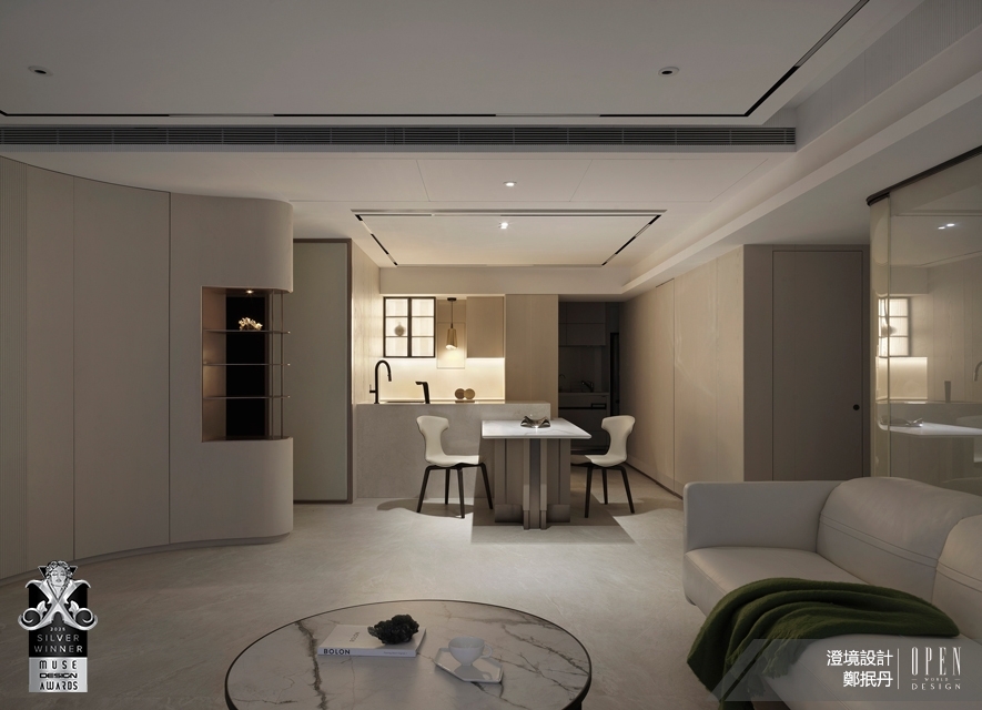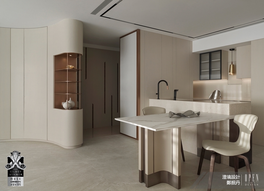 澄境設計 設計總監 鄭抿丹 以米色為主調,結合圓弧曲線與異材質搭配,打造輕盈、純淨的居住空間,設計上兼顧美學與實用性,運用靈活布局提升居家舒適度,為一家四口提供溫馨、優雅的居住體驗,作品《弧光柔藝》受到本屆賽事評審矚目,喜獲銀獎佳績!關於MUSE Design Awards