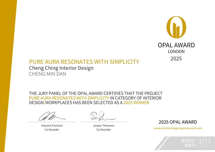 OUTSTANDING PROPERTY AWARD LONDON,OPAL(英國倫敦傑出地產大獎)由全球知名企業集團Farmani Group組織,並以招攬全球最佳建築師、室內設計師與房地產開發商為目標,在創造異業菁英聯合平臺的同時,找尋各地最富創造力、革新感、社會影響力與永續性的設計方案。本屆賽事中,澄境設計 設計總監 鄭抿丹 帶來家宅《弧光柔藝》與商業空間《淨光敘簡》雙作參賽,前者透過寬縫片簾捕捉自然光影,使其在水泥灰地坪上隨時序流轉,整體米色基調搭配簡約線板勾勒出溫暖舒心的氛圍;後者則以大地色藝術漆與柔和弧形背牆,化解冷硬石材的距離感,並運用靈活玻璃隔間兼顧開放性與隱私需求。兩案皆深刻體現大賽所倡導的「創造力」核心理念,於國際設計舞臺上展現精湛實力,雙雙獲得「Winner」佳績!
