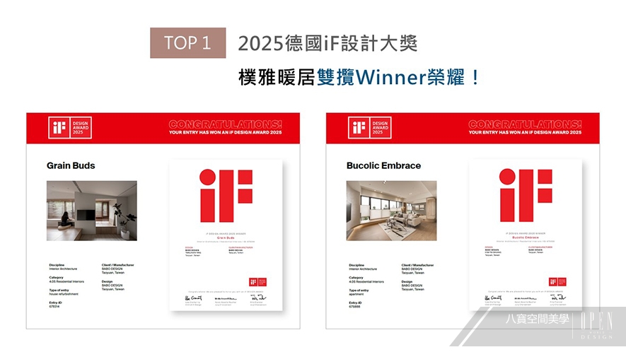 世界四大設計獎之一的德國 iF 設計大獎,在國際間擁有無可取代的指標性及前瞻性。本次八寶空間美學以《小滿》及《山川知韻》參賽,前者於9坪大的案場,透過半高櫃取代隔間牆,打造開闊舒心的機能小宅;後者自下而上堆疊漸淡的色調,結合圓弧修潤轉角、天壁高低落差,映展層次豐富的輕柔畫面。兩間精心之作雙雙贏獲本屆賽事的「Winner」大獎!