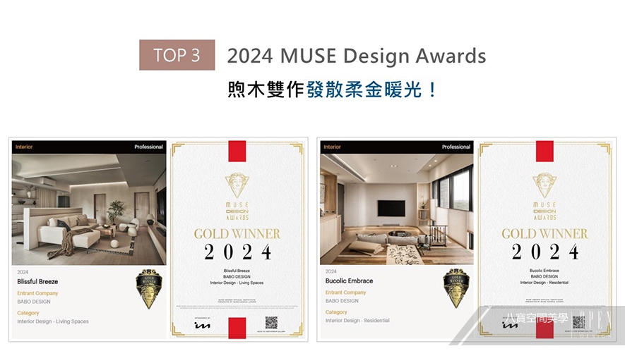 MUSE Design Awards以發掘全球設計繆思為宗旨,為建築、室內、時尚等領域提供全面的發光舞台。八寶以低彩度的米白基底相偕木質曲弧元素,創造一處沉澱身心的家宅《禾日知丘》;另一件作品《山川知韻》同樣施作米色塗料、木格柵,搭配戶外引入的鬱鬱林景,鋪敘清新自適的自然氣息。兩間溫潤美邸皆奪下金獎榮耀,令品牌獨到美學躍登國際舞台!