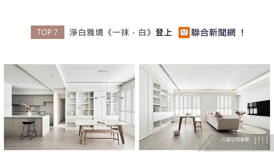 設「少即是多」的極簡美學為作品核心,八寶團隊於全室奠定淨白基底,其間綴點淺灰櫥櫃的自然肌理、溫潤木質桌腳的樸實質感,讓不經意流露的材質變化,成為空間中的細膩層次;而各處嵌設的曲柔線性元素,配合開放書架的俐落分割,增添層次豐富的視覺效果,純粹家宅《一抹,白》的特殊藝韻,受聯合新聞網上刊支持!