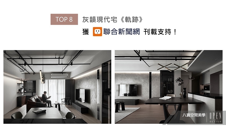 八寶空間美學汲取深淺灰階的沉穩時髦感,將其勻稱調配、遍布於全案各處,勾畫細膩多變的空間層次,佐搭天壁塗抹漆黑的軌道燈具及裸露管線,令現代藝韻間混搭俐落工業調性,形塑業主身為都市男子穩重卻不羈末節的人格特質,個性化住宅《軌跡》喜登聯合新聞網!